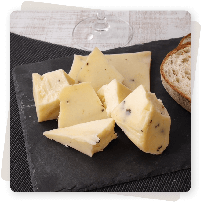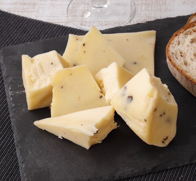 薄く削るだけでも、ふわっとトリュフの香るチーズです。そのままでも、熱を加えてもトリュフを感じられる、コク深い味わいが特徴です。